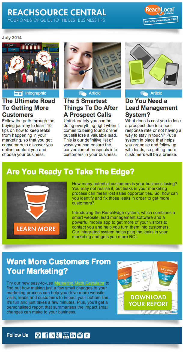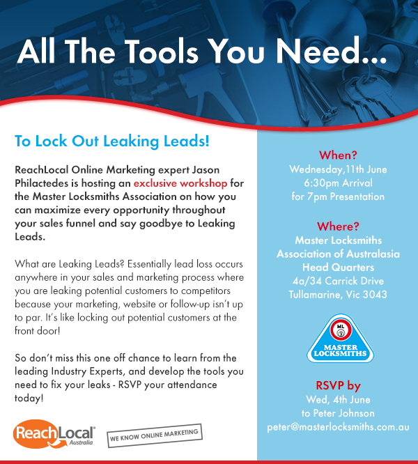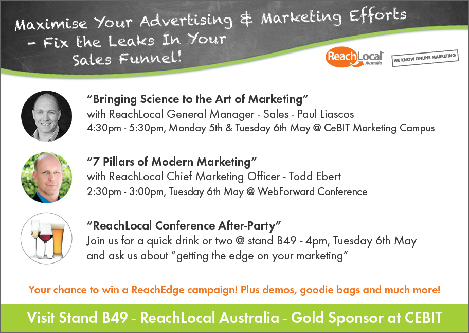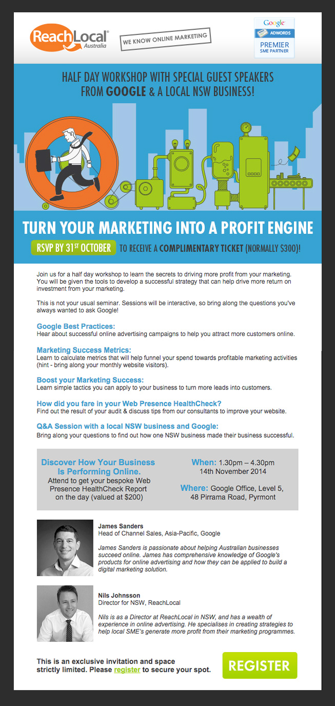 Leveraging ReachLocal’s Google Premier Partner status we often held customer and prospect events featuring speakers from both ReachLocal and Google. I flew interstate to coordinate a number of these cocktail events, seminars and workshops in ReachLocal’s Australian offices and at the Google HQ itself. Featured here are some of the HTML email invitations and advertising flyer designs I created to promote the events.